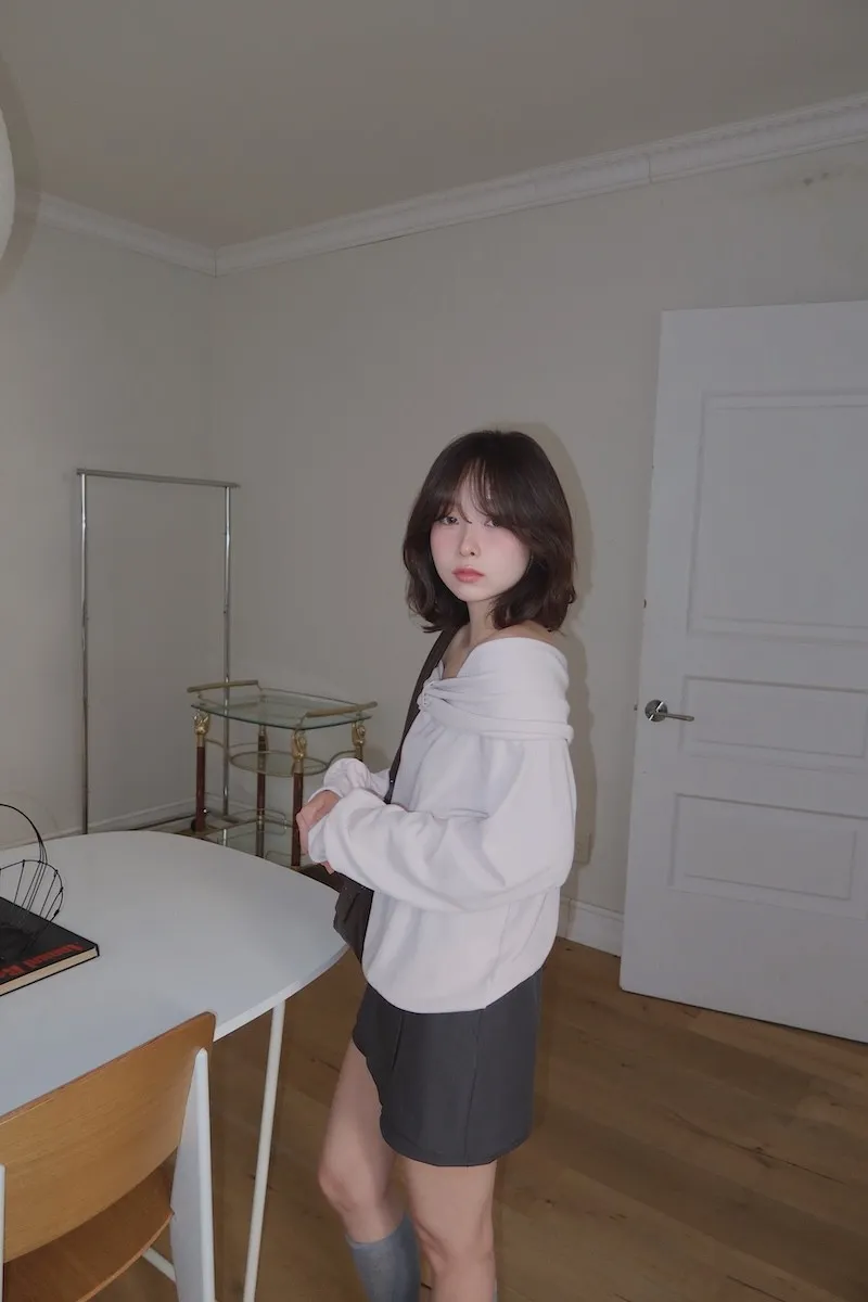 不過這件很棒的地方也在於,他是翻下來的布料去變成一字領的感覺